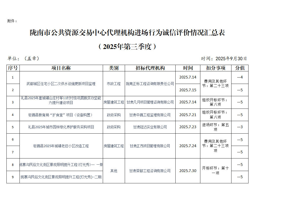 隴南市公共資源交易中心關(guān)于2025年第三季度代理機構(gòu)進場行為誠信評價結(jié)果的公示