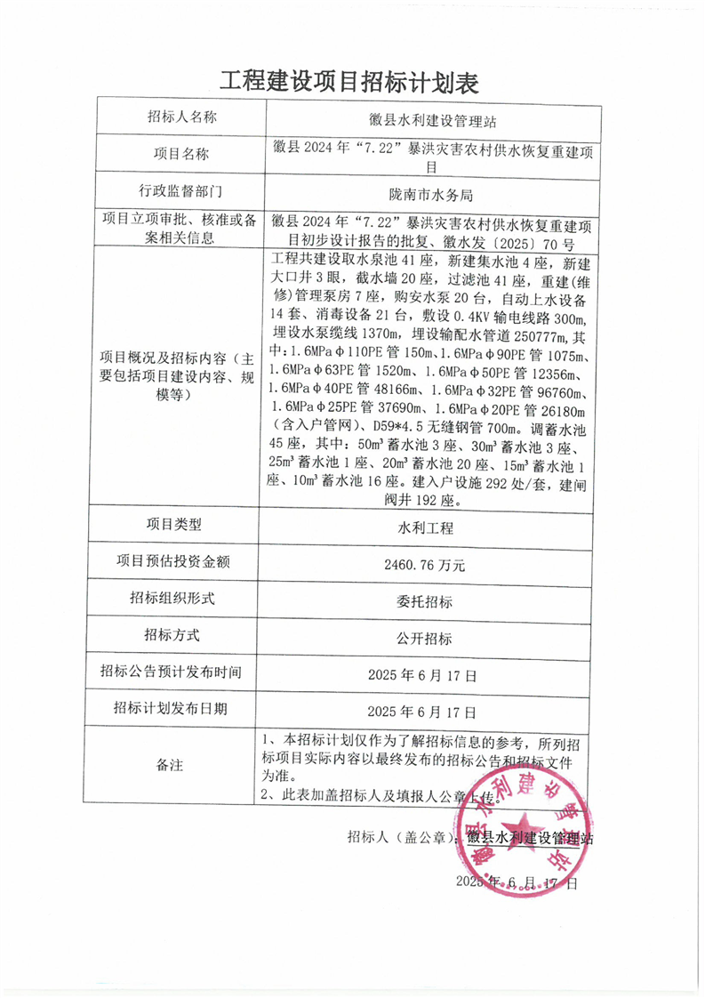 徽縣2024年“7.22”暴洪災(zāi)害農(nóng)村供水恢復(fù)重建項(xiàng)目