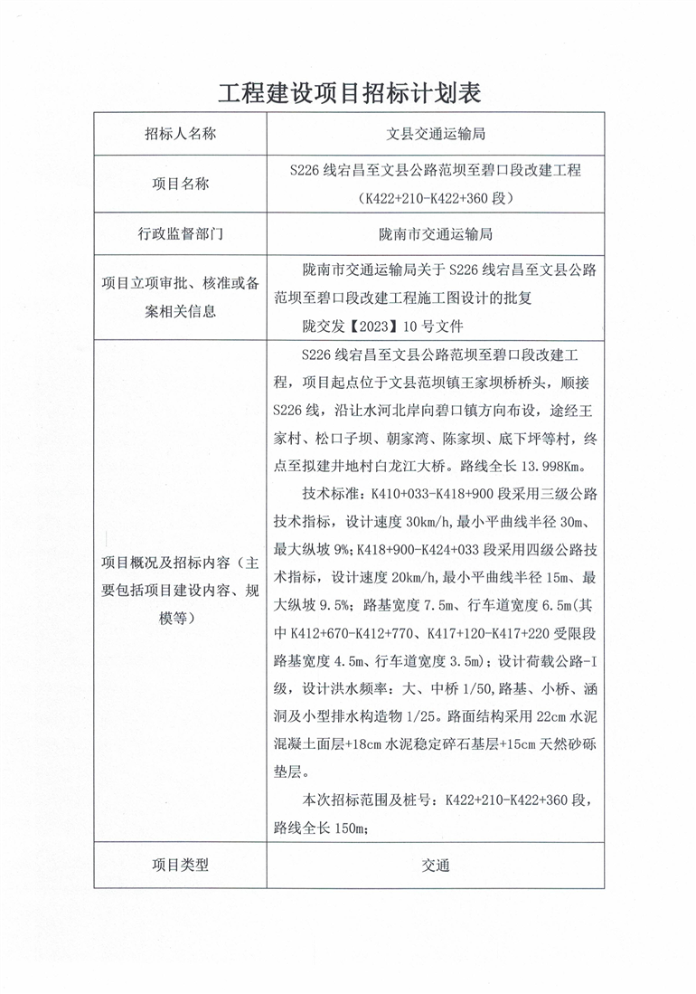 S226線宕昌至文縣公路范壩至碧口段改建工程(K422+360-K423+030段)