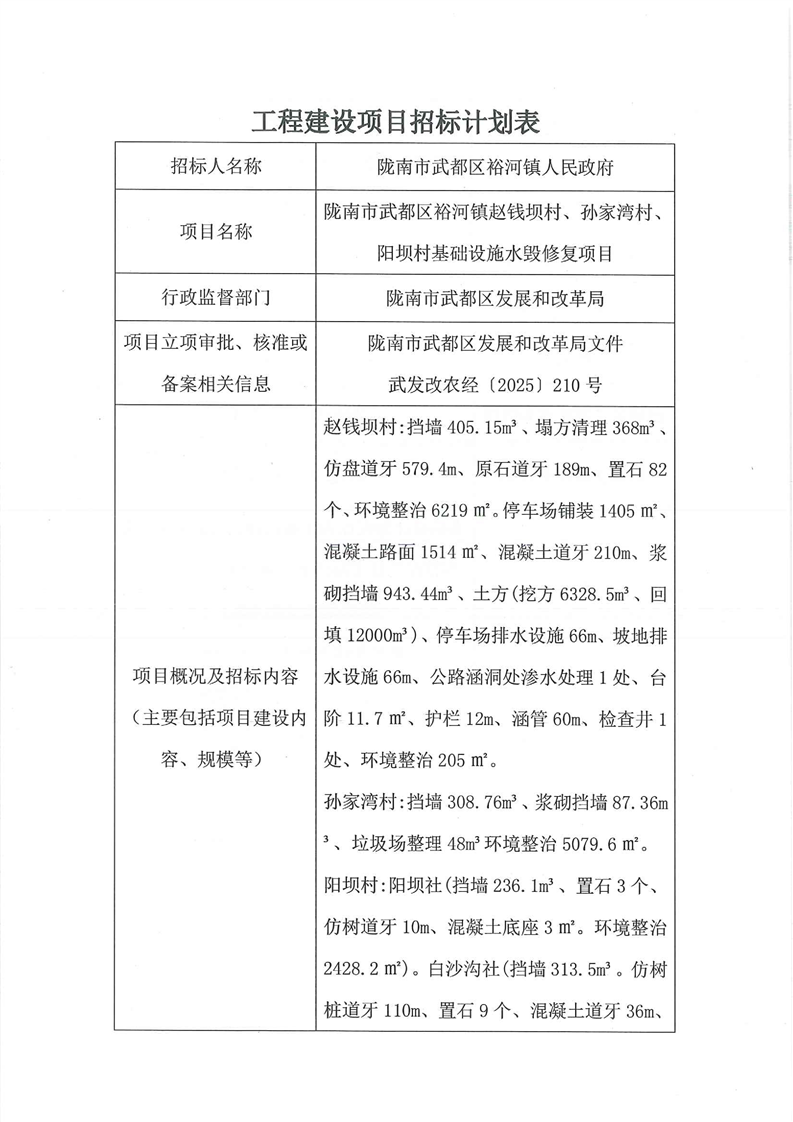 隴南市武都區(qū)裕河鎮(zhèn)趙錢壩村、孫家灣村、陽(yáng)壩村基礎(chǔ)設(shè)施水毀修復(fù)項(xiàng)目