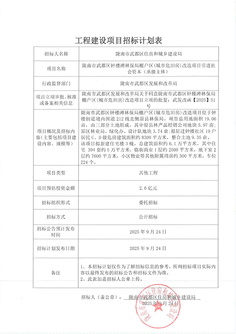 隴南市武都區(qū)鐘樓灘林保局棚戶(hù)區(qū)(城市危舊房)改造項(xiàng)目引進(jìn)社會(huì)資本(承接主體)