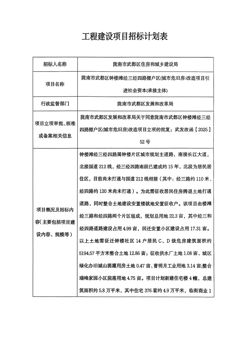 隴南市武都區(qū)鐘樓灘經(jīng)三經(jīng)四路棚戶區(qū)(城市危舊房)改造項(xiàng)目引進(jìn)社會(huì)資本(承接主體)