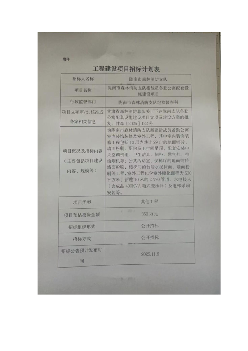 隴南市森林消防支隊(duì)指戰(zhàn)員備勤公寓配套設(shè)施建設(shè)項(xiàng)目