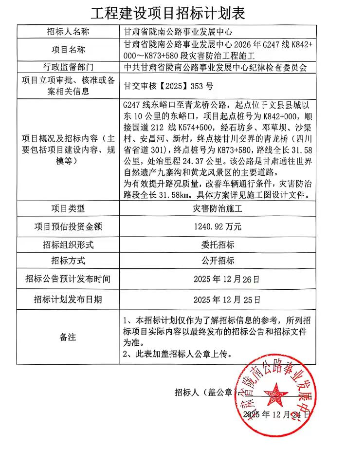 甘肅省隴南公路事業(yè)發(fā)展中心2026年G247線(xiàn)K842+000~K873+580段災(zāi)害防治工程施工