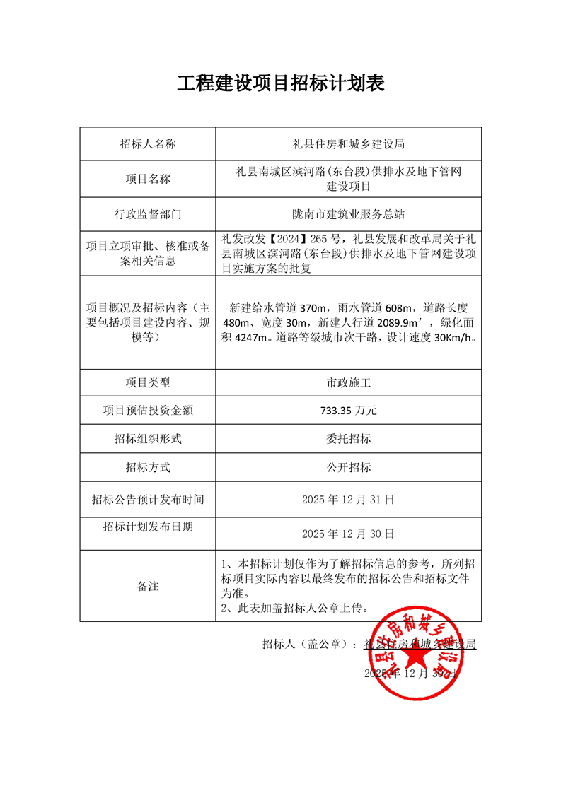 禮縣南城區(qū)濱河路(東臺段)供排水及地下管網建設項目