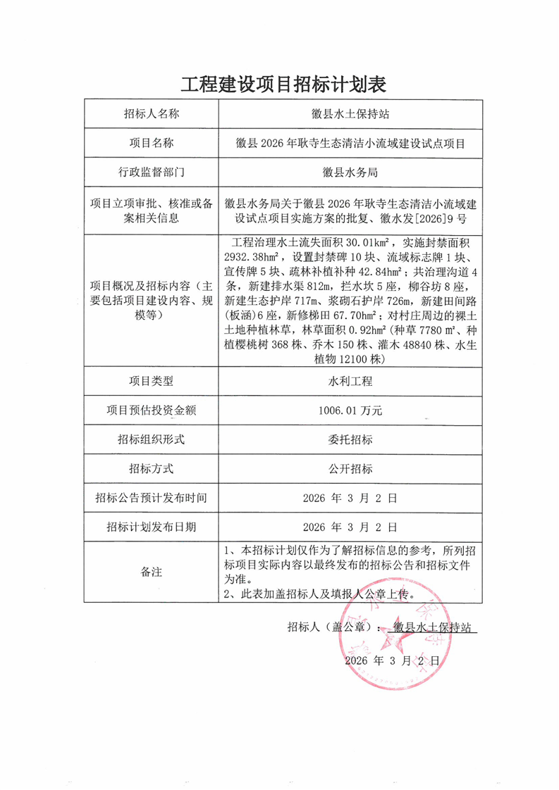 徽縣2026年耿寺生態(tài)清潔小流域建設(shè)試點項目