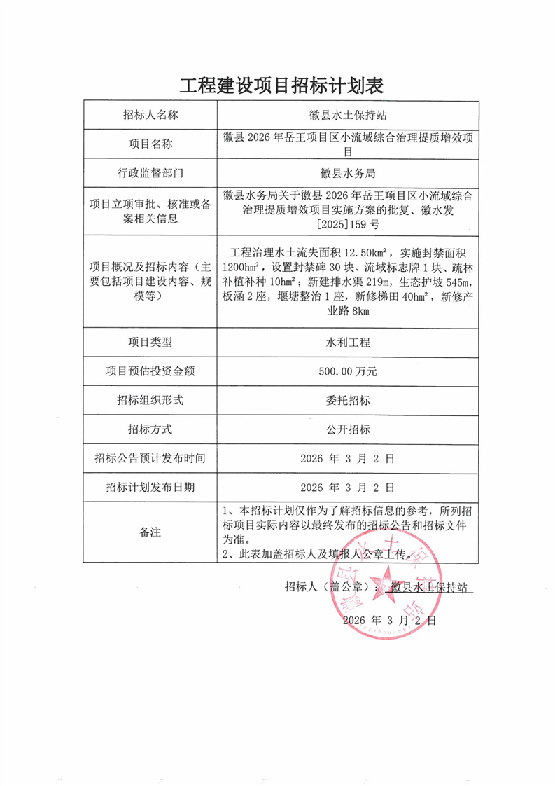 徽縣2026年岳王項目區(qū)小流域綜合治理提質增效項目