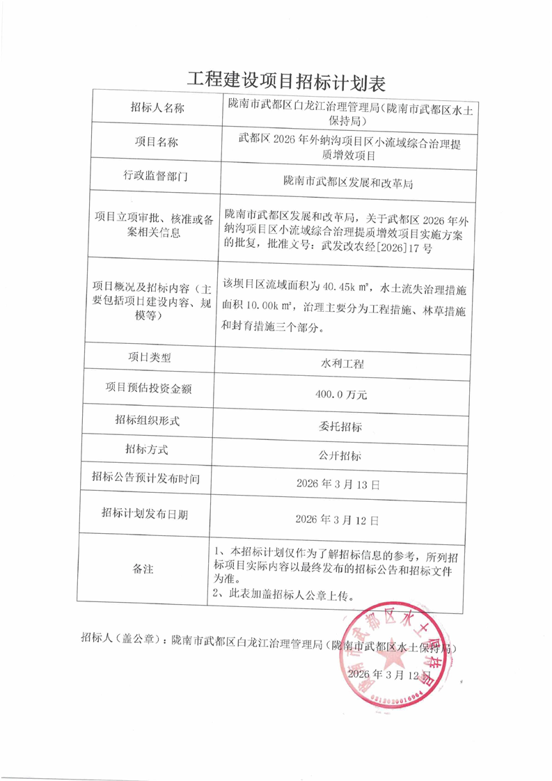 武都區(qū)2026年外納溝項目區(qū)小流域綜合治理提質增效項目